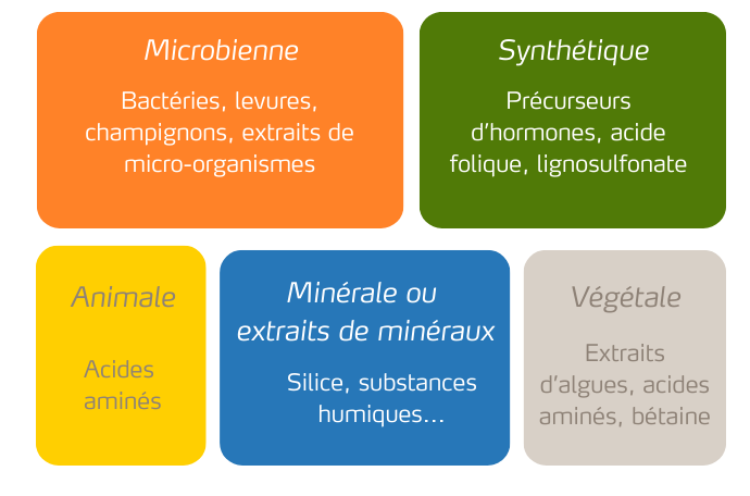 Les biostimulants se classent selon leur origine : animale, végétale, microbienne, synthétique, minérale ou extraits de minéraux.