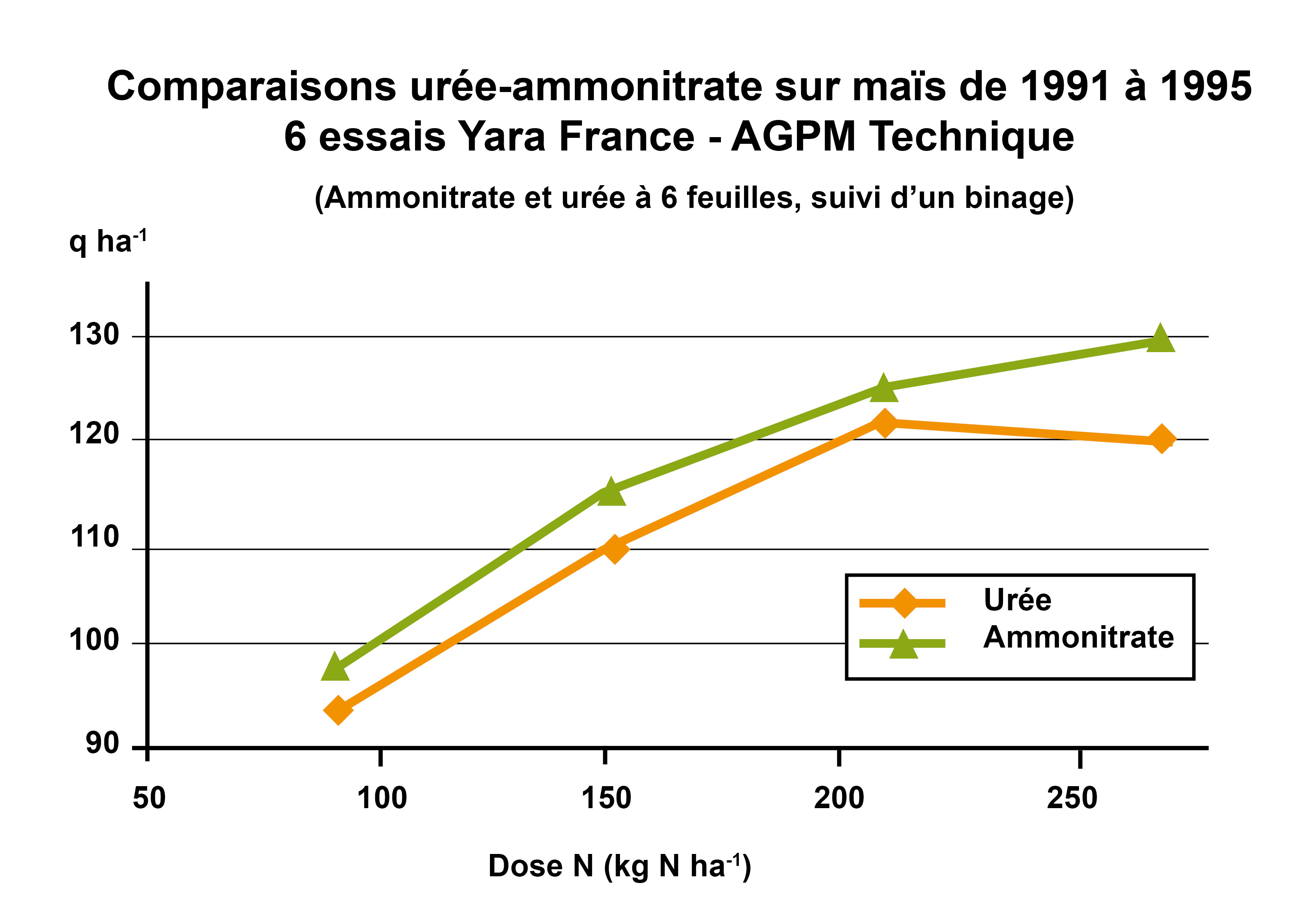 Depuis cette époque, des essais comparatifs entre ces deux formes d’azote ont été conduits régulièrement avec des modalités différentes pour établir les meilleures recommandations possibles : doses, stade d’apport, technique d’apport (en plein ou enfoui), conditions pédoclimatiques...Et depuis 30 ans, la conclusion reste la même : on obtient de meilleurs rendements en maïs avec l’ammonitrate qu’avec l’urée (Figure 2).