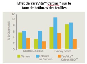 Certaines sources de calcium, tel que les carbonates de calcium, peuvent être appliqués pour limiter les attaques parasitaires et les coups de soleil. Ce sont des substances naturelles pulvérisées directement sur le fruit et qui font barrières entre les bio-agresseurs et le fruit. Ces produits n’ont généralement pas de valeur nutritive. YaraVita™ Caltrac™ fait exception grâce à une finesse des particules et une formulation spécifique assurant une efficacité nutritive maximale. Sa granulométrie contrôlée présente aussi l’avantage d’apporter un effet “Slow Release” (libération prolongée dans le temps) permettant ainsi de ralentir la cadence des traitements. Enrichi en bore et en zinc, ce produit contribue activement à l’absorption et à l’efficacité du calcium.