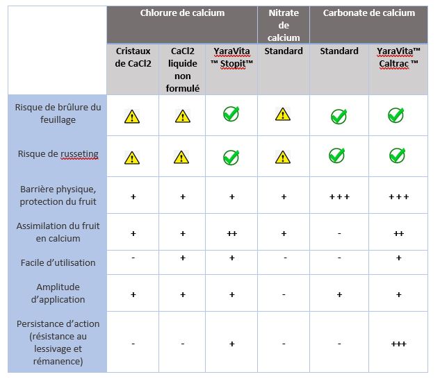 Des apports complémentaires par voie foliaire s’avèrent souvent indispensables pour équilibrer ou maintenir le taux de calcium des fruits, et ce notamment lors de la phase de grossissement lorsque le calcium ne migre plus vers les fruits. Différentes sources et différentes qualités de calcium, sont disponibles sur le marché des produits foliaires. Aussi quelle que soit la forme chimique choisie, puisqu’il est projeté sur le fruit, il est fondamental de choisir un calcium foliaire de qualité alimentaire. Il est également important qu’il n’entraine pas de rugosité.