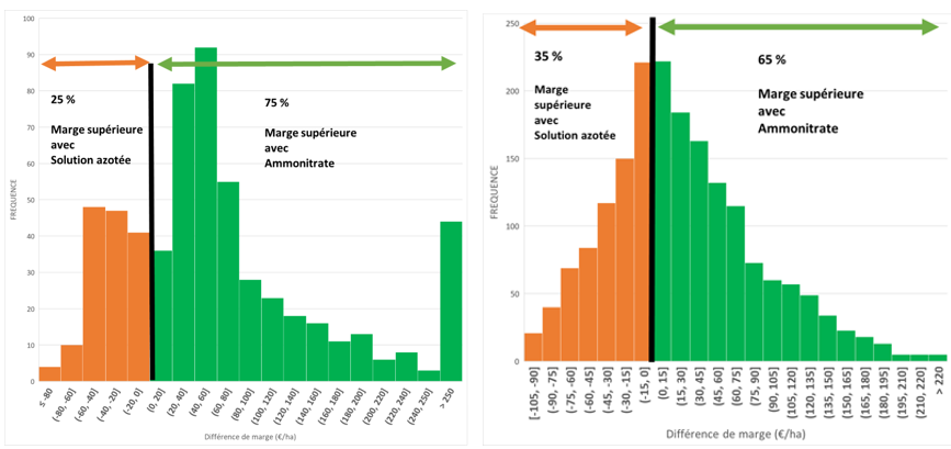 Figure 2 : Distribution des écarts de marge entre ammonitrate et solution azotée sur colza – 585 situations simulées (à gauche) et sur blé tendre – 1860 situations simulées (à droite). Source : étude ADA – UNIFA (2021).