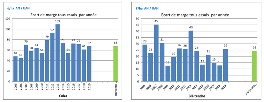 Le surdosage parfois pratiqué avec la solution azotée pour compenser sa moindre efficacité, contestable sur le plan environnemental, ne permet pas d’atteindre les niveaux de performance obtenus avec l’ammonitrate. Et malgré un surcoût de l’unité d’azote, cette différence d’efficacité agronomique se traduit aussi par un gain de marge notable pour l’ammonitrate, aussi bien en colza qu’en blé.