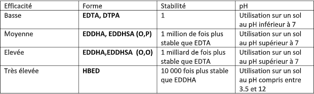 Dans la forme EDDHA, il convient aussi de distinguer 2 types d’isomères : ortho/ortho et ortho/para. La forme ortho/ortho est à favoriser car elle résiste plus longtemps aux dégradations causées par le pH élevé du sol et par les fortes teneurs en calcaire actif. Elle augmente également la rémanence donc l’efficacité du produit sur le long terme.