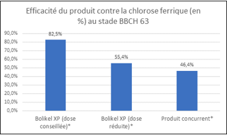 L’efficacité des produits contre la chlorose ferrique (exprimée en %) est calculée par un ratio entre les notations chlorose dans les parcelles fertilisées au chélate de fer et celles des témoins adjacents. YaraTera Bolikel XP® appliqué à dose conseillée s’est clairement démarqué par une efficacité proche de 85%.