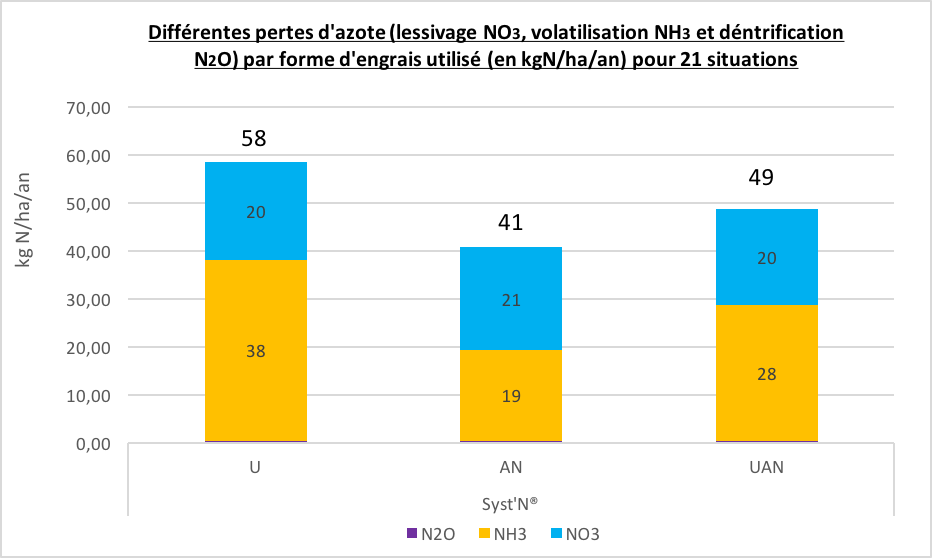 Les pertes liées à la volatilisation ammoniacale (émission de NH3) sont très importantes lors de l’utilisation de l’urée (38 kg N/ha/an environ) et de la solution azotée (28 kg N/ha/an). Elles sont beaucoup moins importantes lors de l’utilisation d’ammonitrate, avec seulement 19 kg N/ha/an.