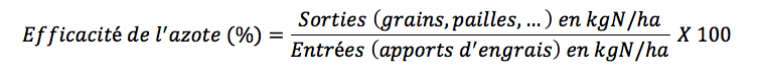 L’indicateur utilisé correspond au NUE (Nitrogen Use Efficiency : un calcul développé par le groupe d’expert européen sur les enjeux liés à l’azote, le European Nitrogen Expert Panel). Il s’agit d’un ratio entre les entrées et les sorties du système :