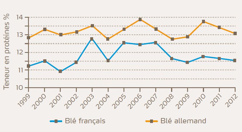 L'évolution des teneurs en protéines du blé dans les 2 pays révèlent un écart significatif.