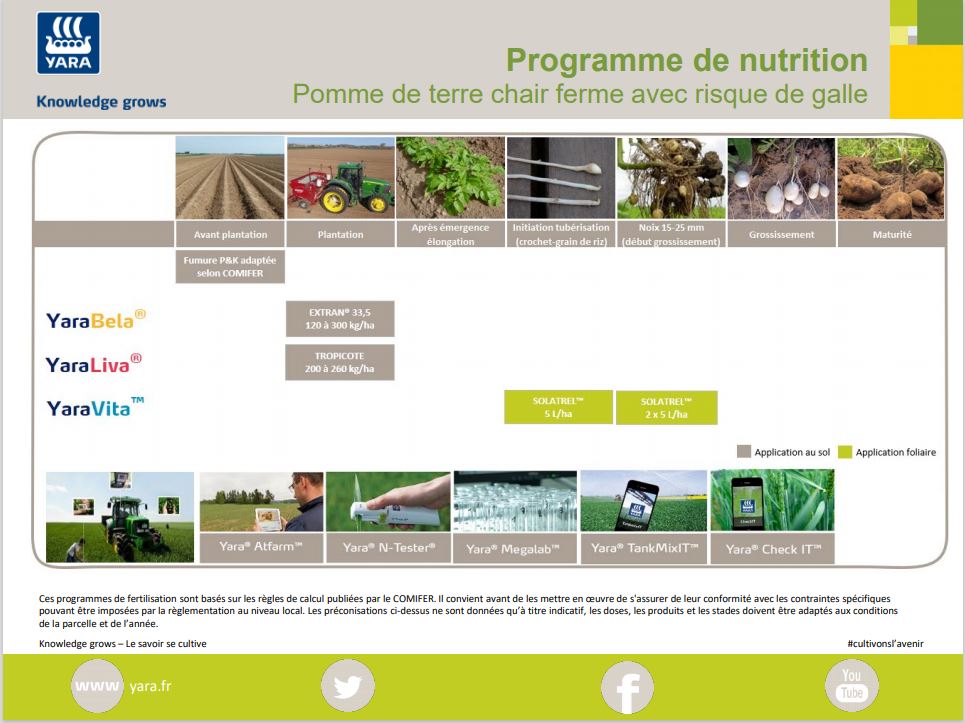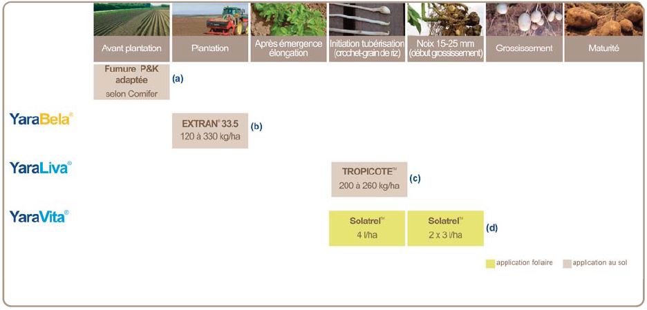 Calculez la fertilisation azotée totale par la méthode du bilan prévisionnel du COMIFER. La dose totale N est apportée à la plantation, une partie sous forme de YaraLiva TROPICOTE pour la qualité de peau des tubercules, le solde sous forme de YaraBela EXTRAN 33,5.