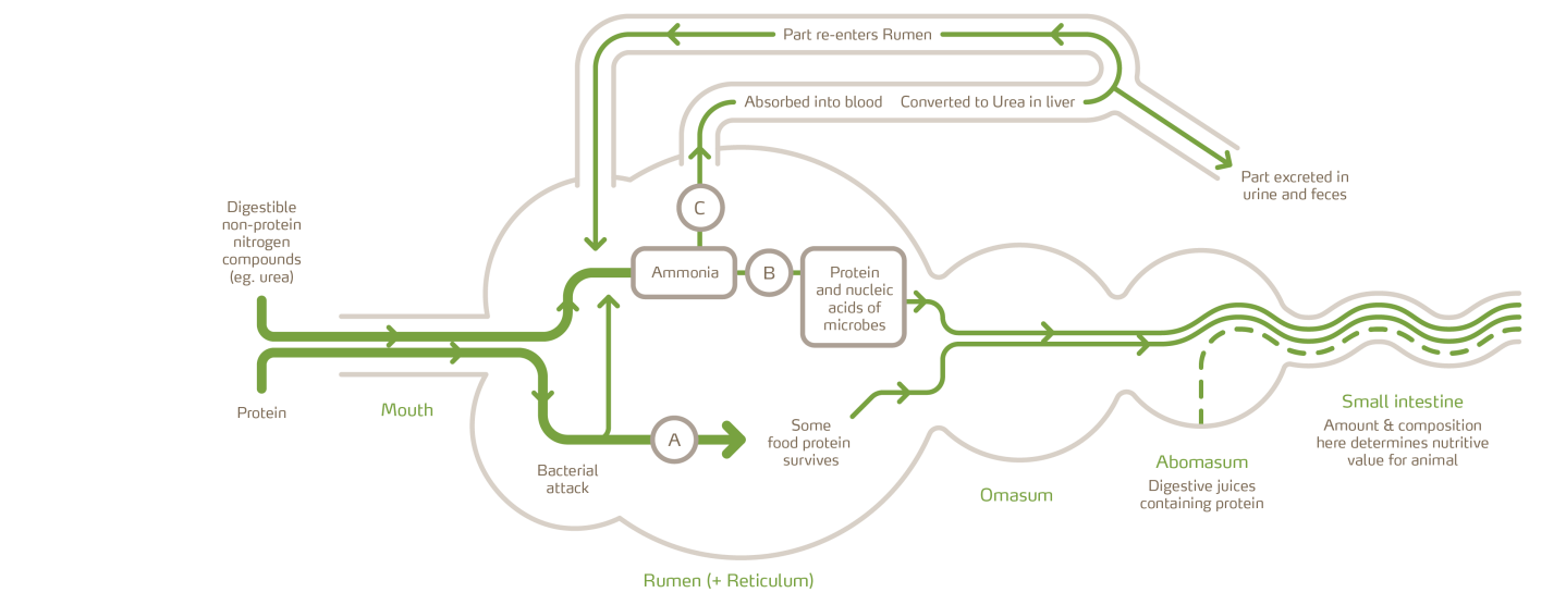 Les protéines solubles doivent être équilibrées dans les rations des ruminants pour permettre une croissance microbienne maximale et donc une synthèse microbienne des protéines.